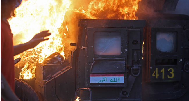 As dusk fell in Baghdad, crowds swelled around the capital’s oil and industry ministry, pledging to march to the capital’s emblematic Tahrir (Liberation) Square.